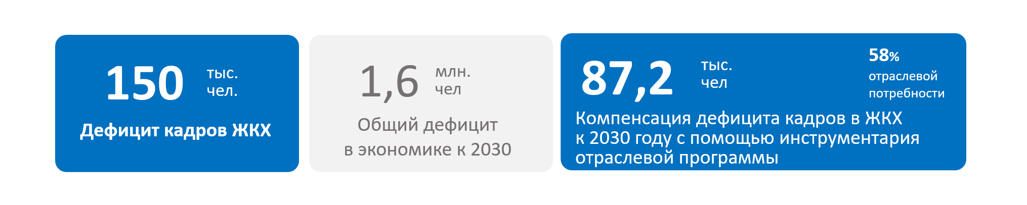 Главный вызов отрасли — дефицит кадров в 150 тысяч человек. Это означает, что по различным факторам: высокая текучесть, низкая привлекательность профессий, низкий уровень квалификации кадров и демографического спада, для обслуживания коммунальной инфраструктуры не хватает 150 тыс. ед. персонала.