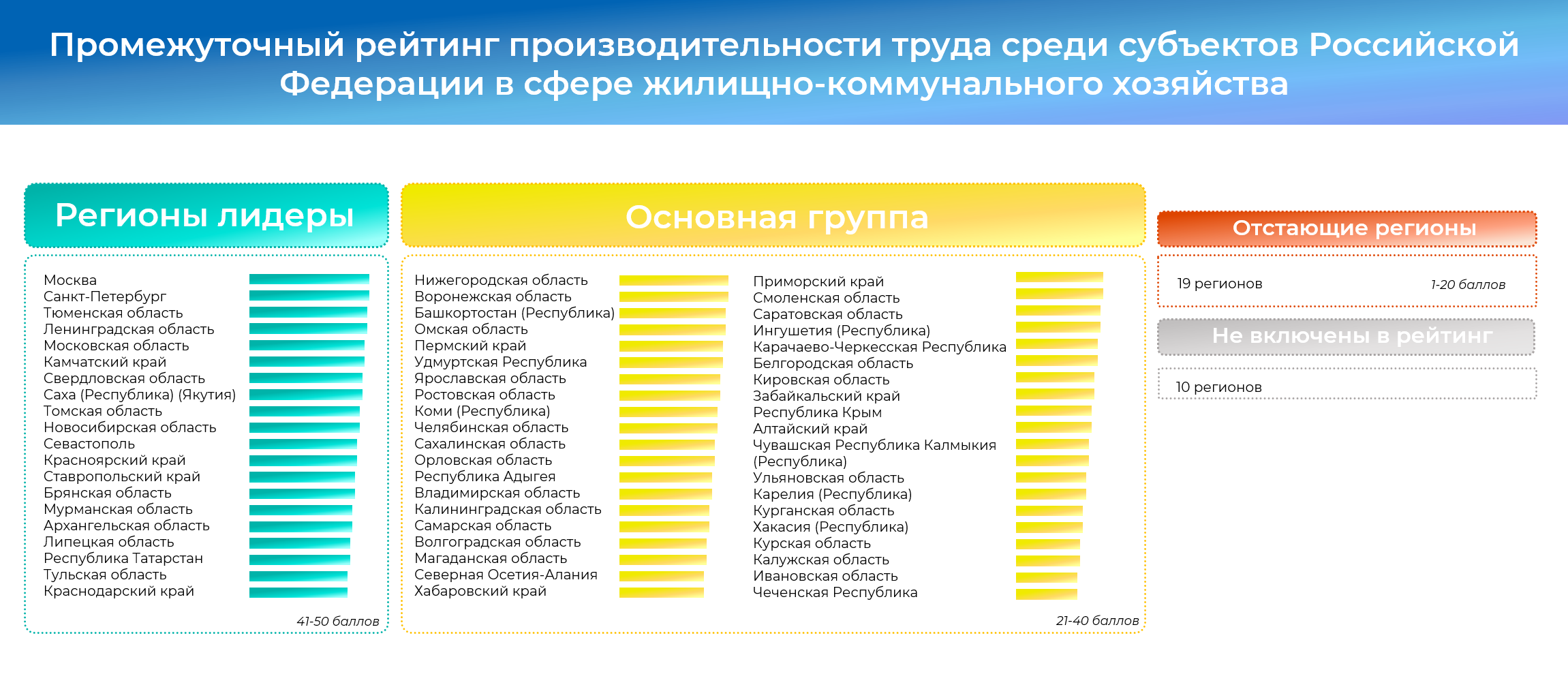 Таким образом, рейтинг служит инструментом мониторинга уровня производительности труда, стимулирует регионы активно распространять культуру бережливого производства, что в конечном итоге способствует достижению поставленных целей отраженных в Указе Президента Российской Федерации от 7 мая 2024 г. № 309 «О национальных целях развития Российской Федерации на период до 2030 года и на перспективу до 2036 года» и стимулирует общее развитие отрасли ЖКХ.