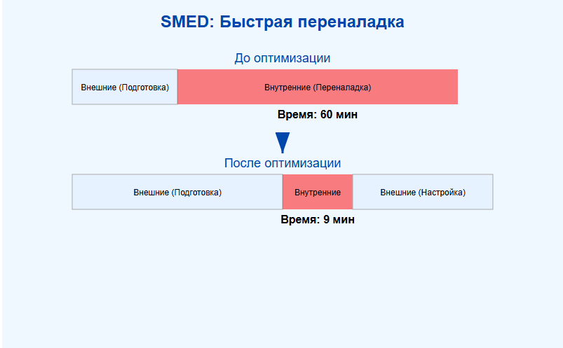 SMED — это методология, направленная на сокращение времени переналадки оборудования или перехода от одного процесса к другому. Основная идея заключается в разделении операций переналадки на внутренние (те, которые можно выполнять только при остановленном оборудовании) и внешние (те, которые можно выполнять во время работы оборудования), с последующим преобразованием внутренних операций во внешние и оптимизацией всех операций.