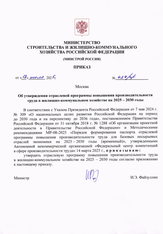 В соответствии с Указом Президента Российской Федерации от 7 мая 2024 г. № 309 «О национальных целях развития Российской Федерации на период до 2030 года и на перспективу до 2036 года», постановлением Правительства Российской Федерации от 31 октября 2018 г. № 1288 «Об организации проектной деятельности в Правительстве Российской Федерации» и Методическими рекомендациями МР-08-2025 «Порядок формирования паспорта отраслевой программы повышения производительности труда для базовых несырьевых отраслей экономики на 2025 - 2030 годы (временный)», утвержденными Автономной некоммерческой организацией «Федеральный центр компетенций в сфере производительности труда» 14 марта 2025 г., Министром строительства и жилищно-коммунального хозяйства Российской Федерации утверждена отраслевая программа повышения производительности труда в жилищно-коммунальном хозяйстве на 2025 — 2030 годы (Приказ № 434/пр от 18.07.2025 г.)