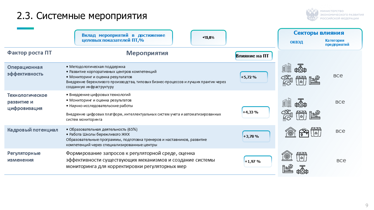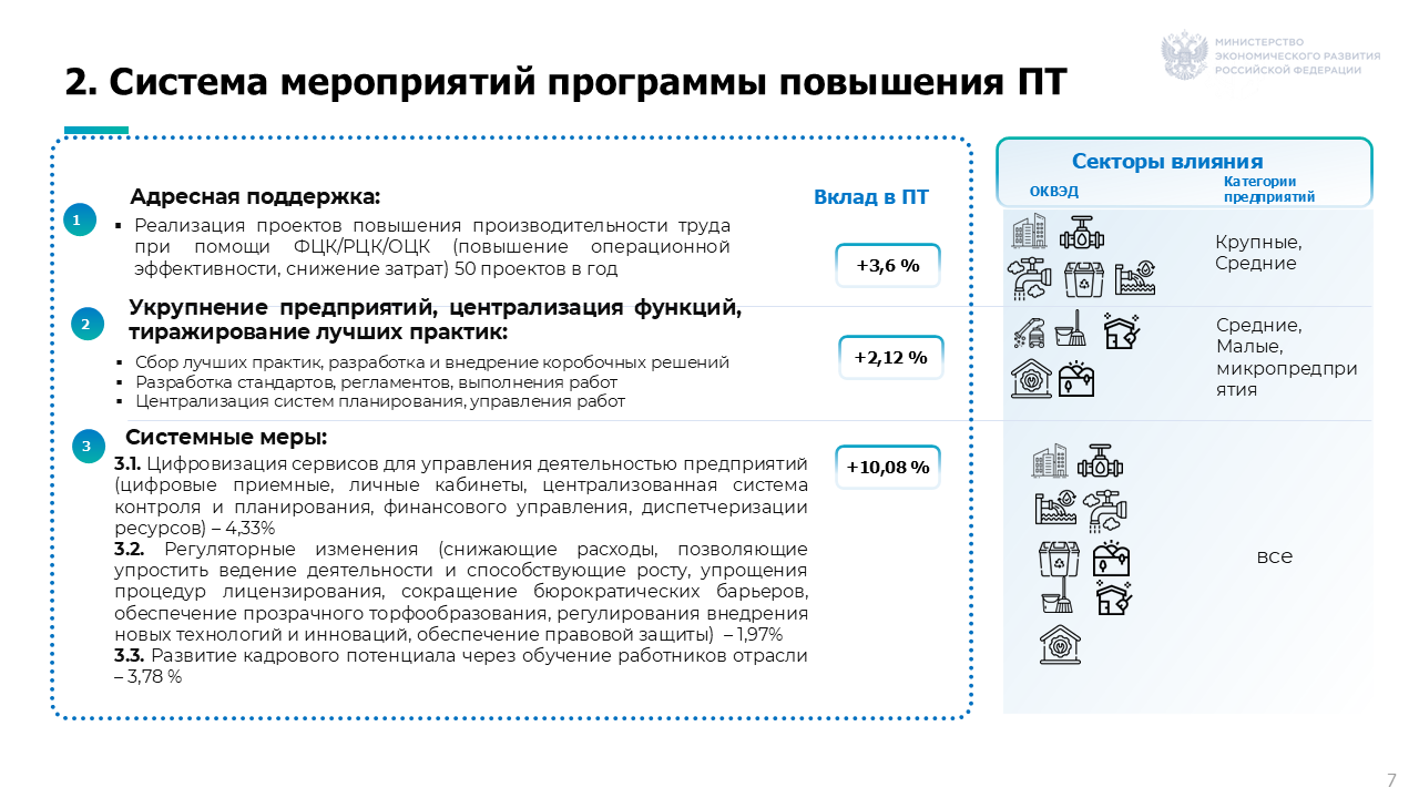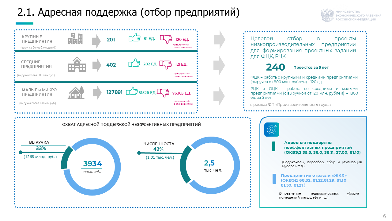 Адресная поддержка, включающая реализацию проектов по повышению ПТ на предприятиях. Реализацию проектов планируется осуществлять силами ФЦК и РЦК. Данные меры предусматривают поддержку крупных и средних предприятий в направлении деятельности 35.3 «Производство, передача и распределение пара и горячей воды», 36.0 «Забор, очистка и распределение воды», 37,0 «Сбор и обработка сточных вод», 38.11 «Сбор неопасных отходов» и 81.10 «Комплексное обслуживание помещений», деятельность которых оказывает существенное влияние на отраслевой показатель ПТ.