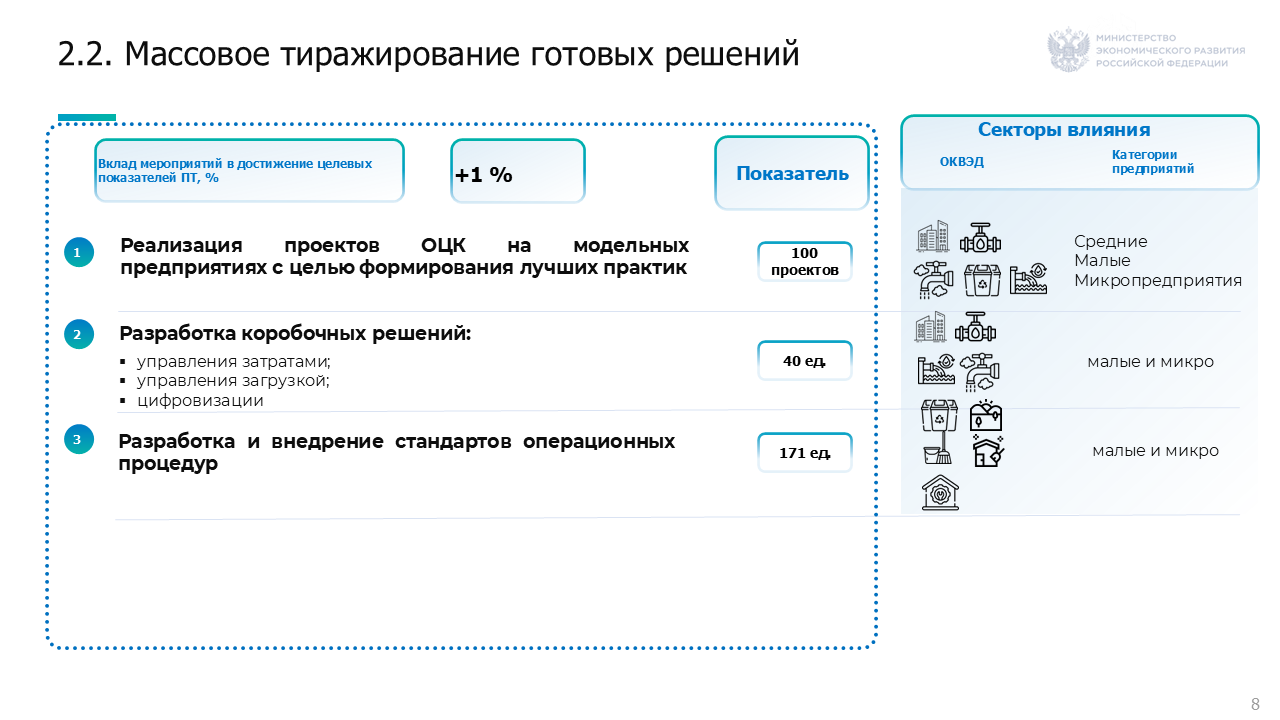 Массовое тиражирование готовых коробочных решений, направленное на повышение показателя ПТ в сегменте участников отрасли «средние», «малые» и «микропредприятия».