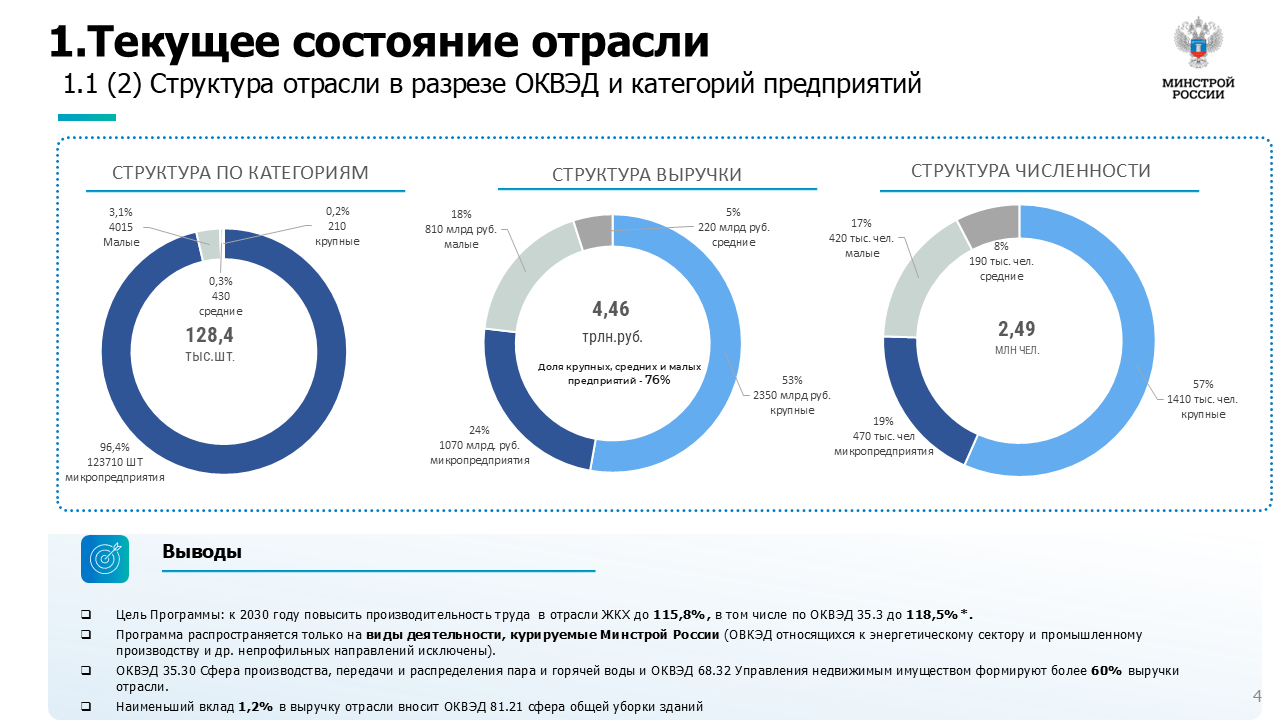 При этом, несмотря на основную долю в отраслевом составе, малые и микропредприятия имеют совокупный вклад в отраслевую выручку 42,1 % (1,88 трлн, рублей), а остальные порядка 58 % (2,57 трлн, рублей) формируются за счет деятельности 640 предприятий, относящихся к категориям «крупные» и «средние».