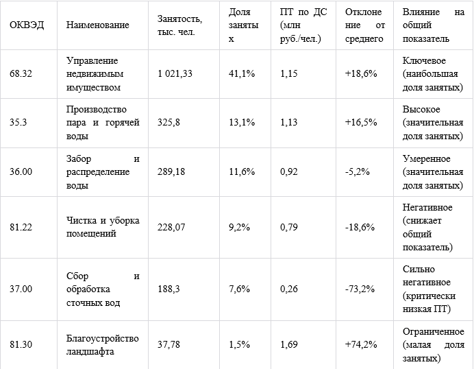 Высокий приоритет: ОКВЭД 68.32 (41,1% занятых) - даже небольшое повышение ПТ даст существенный вклад в общий показатель