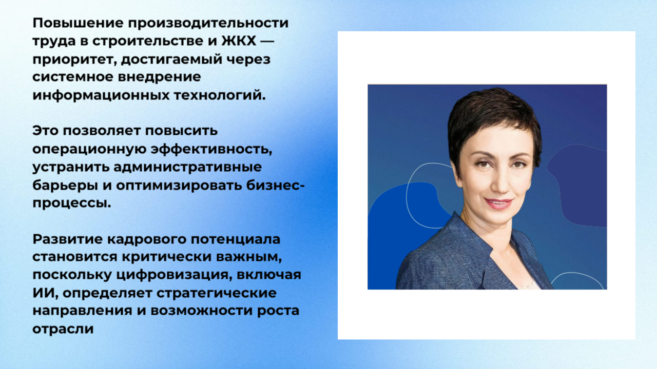Руководитель отраслевого центра компетенций производительности труда в ЖКХ - Постовалова Алина Анатольевна, заместитель директора, руководитель Университета Минстоя  НИИСФ РААСН