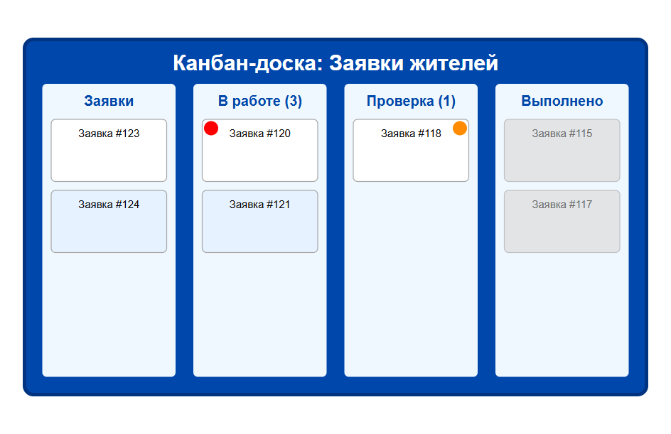 - Обработка заявок жителей: канбан-доска с колонками "Новые заявки", "Назначено", "В работе", "Проверка", "Закрыто", что позволяет сократить время обработки заявок на 40%
